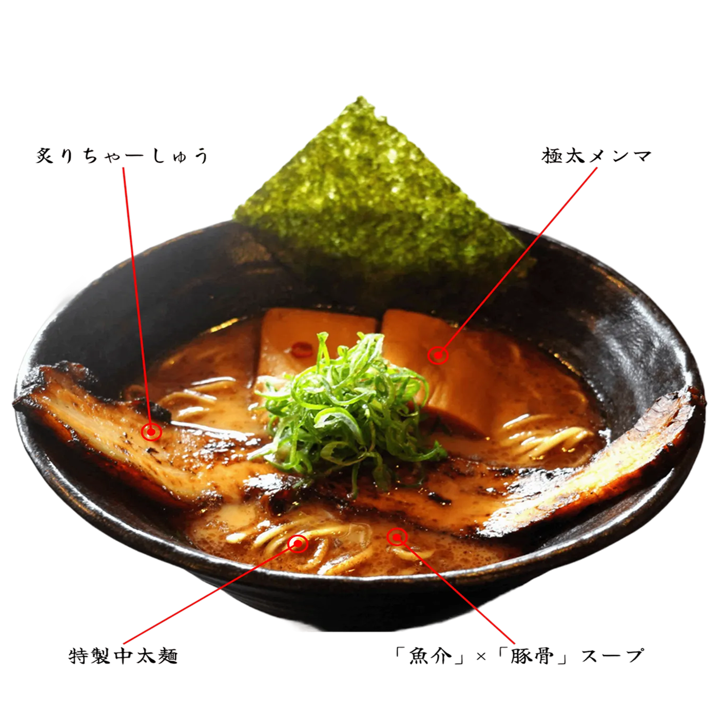 魚介と豚骨がそれぞれ主張しつつも、絶妙なバランスで合流したスープ。これがよく絡み、ちゃんとした食感もある中太ストレート麺。見た目のインパクトに負けない味わいの具材。